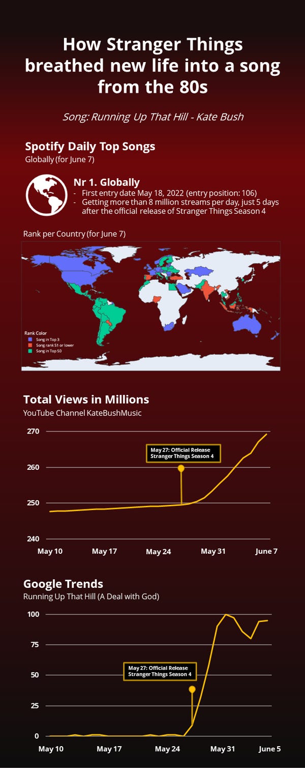 An interesting infographic that shows the impact of a song’s usage in popular media. In this case: Stranger Things using Running Up That Hill in the series’ latest season.