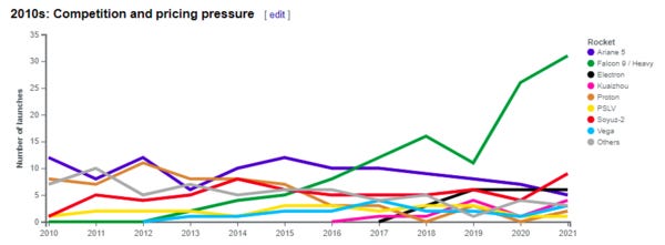 Using its partially reusable technology, the firm has dramatically reduced the cost to orbit. This has led to the firm quickly gaining market share, now sitting at above 65% (development shown below, thanks to Wikipedia).